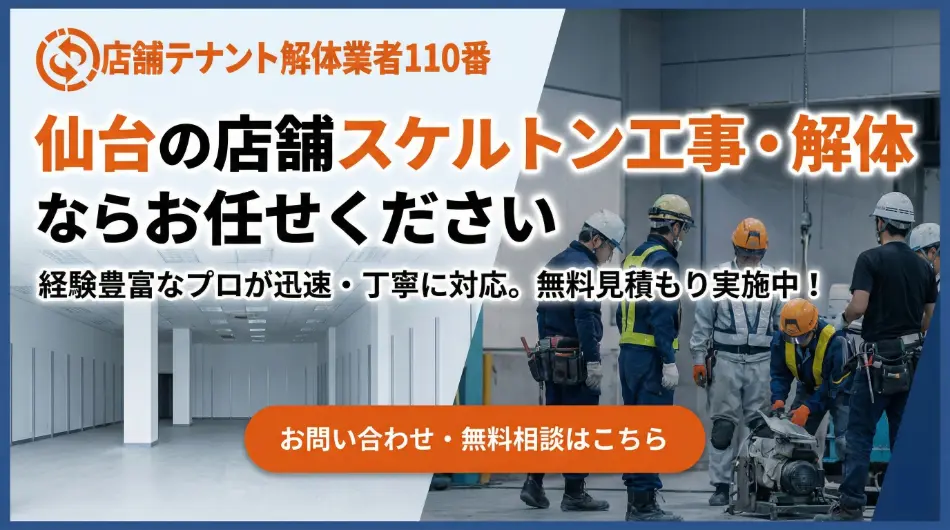 店舗テナント解体業者110番は、仙台市・宮城県全域で店舗のスケルトン工事を専門に行っています。現地調査・お見積りは無料です。まずはお気軽にご相談ください。